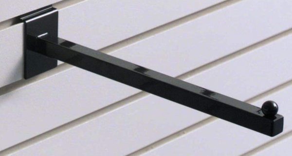 Nuestro gancho recto de tubo cuadrado tiene un acabado negro, mide 12 ” y se adapta a  los paneles slatwall. Viene en un diseño recto tradicional y cuenta con una bola en el extremo para que tu percha o ropa no se resbale.