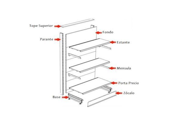 Consta de 1 parante con sus bases, 4 bandejas, 6 ménsulas, fondos, porta precios transparente para cada bandeja, tope superior y zócalo.