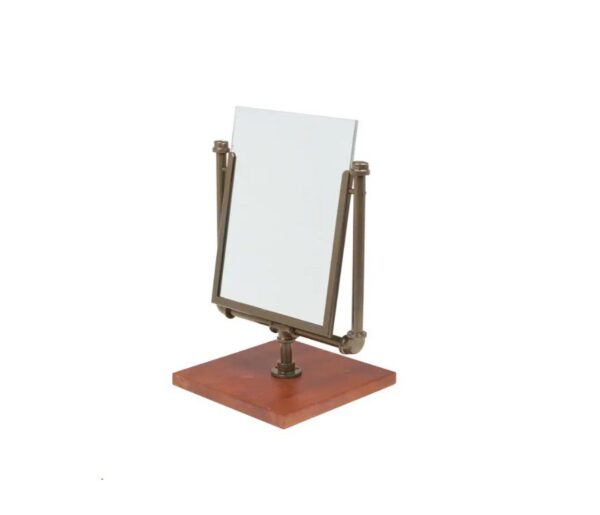 Este espejo de exhibición mide 10″ de alto x 7-7/8″ de ancho con una altura total de 13-9/16″ de alto. Su base en tono madera de cerezo mide 8″ cuadrados x ¾» de grosor.